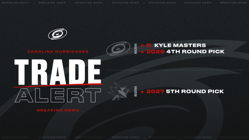 The Carolina Hurricanes have acquired defenseman Kyle Masters and a 2026 fourth-round pick from the San Jose Sharks in exchange for a 2027 fifth-round pick.