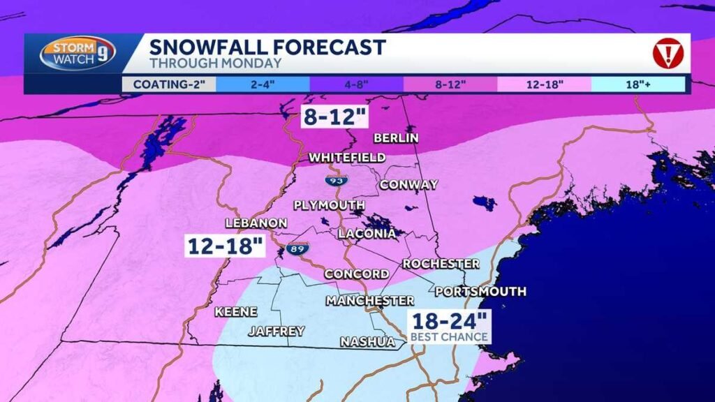 A long-duration winter storm is hitting New Hampshire, with impacts lasting through Monday evening. Over a foot of snow had already accumulated in southern parts of the state by Sunday night. The storm is expected to bring 12 to 18 inches of snow to central and southern regions, with some areas seeing up to 24 inches. Northern New Hampshire is anticipating 8 to 12 inches.